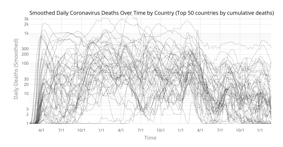 This variant shows daily death numbers, smoothed using the repeated averaging technique described in D3: Histogram Blur / Smoothing, for the top 20 countries by cumulative deaths.
