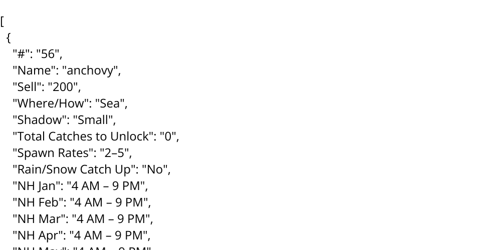Data on all the fish from Animal Crossing New Horizons! https://www.kaggle.com/datasets/jessicali9530/animal-crossing-new-horizons-nookplaza-dataset