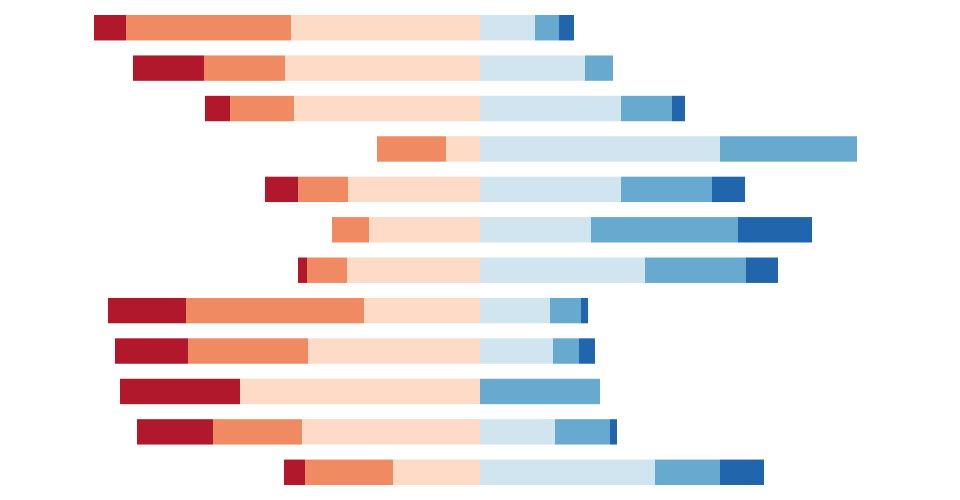Diverging Likert Scales! This shows the percentages of each count of repsonses. Imagine the colors go strongly disagree, disagree, slightly disagree, slightly agree, agree, strongly disagree. I represented each of these 6 likert options as an array of 6 integers. The size of the bars correspond to the percentage that that options is of the total responses, centered at 0. This can show general sentiment of a count.