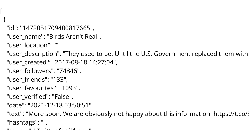 All the ~3500 posts in #birdsarenotreal hashtag and from the @birdsarenotreal twitter account from Dec 9 2021 - Mar 8 2022. https://www.kaggle.com/datasets/gpreda/birds-arent-real-on-twitter-either