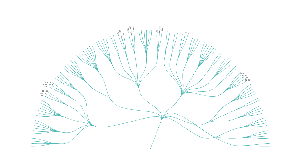 Radial Tree Visualization of Countries Hierarchy. Has Panning and Zooming interaction.