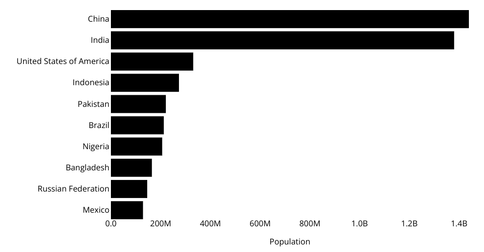 A program that shows the top 10 most populous countries as a pathetic bar chart with no axes.