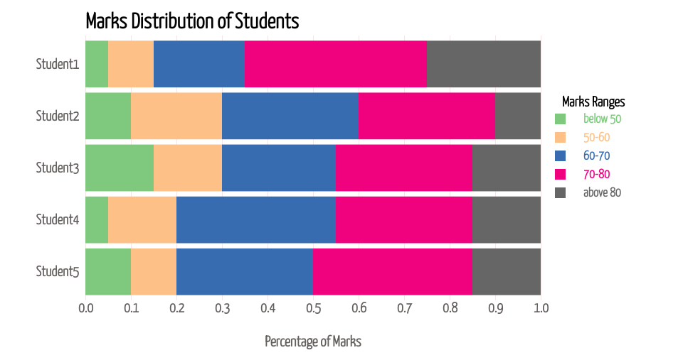 This stacked bar chart represents the percentage distribution of different mark ranges across various students. The aim is to visualize how student performance varies across different mark levels. When the mouse hovers over a segment of the bar, a tooltip displays the precise percentage of that particular mark range for the selected student. The total percentage adds up to 1, indicating 100%.