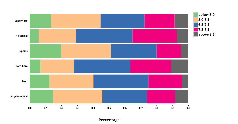 This dataset shows the distribution of movie ratings across six genres: Superhero, Historical, Sports, Rom-Com, Noir, and Psychological. Each genre is broken down into five rating categories: below 5.0, 5.0-6.5, 6.5-7.5, 7.5-8.5, and above 8.5. For most genres, a significant portion of movies fall in the 5.0-7.5 range, with smaller percentages in the highest and lowest rating categories. The 6.5-7.5 range tends to have the highest concentration for genres like Historical, Noir, and Rom-Com, while movies rated above 8.5 generally make up the smallest percentage across all genres.