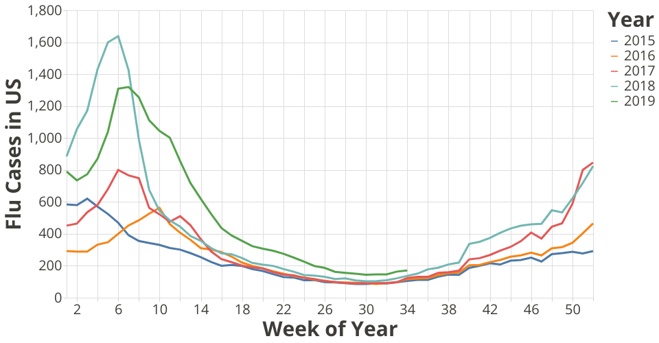 This graph shows the national ILI total cases annually. The curves from 2015 to 2019 to the present date are displayed. This plot achieves the visualization of the annual ILI total patterns in general, and also provide a direct comparison year-over-year. We can tell 2018 is the year with highest Flu cases in mid February time, while 2019 has a more stretched Flu season comparing to other years.