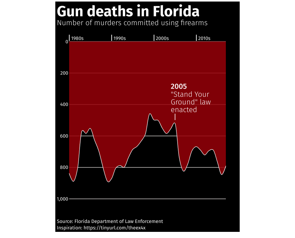 The original visualization appeared in the article This Chart Shows An Alarming Rise In Florida Gun Deaths After 'Stand Your Ground' Was Enacted article by Pamela Engel on Business Insider on February 18, 2014.