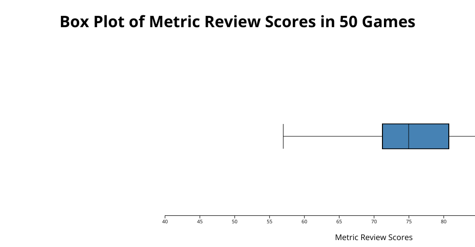 A Box Plot of Metric Review Scores across 50 games, the lines are interactive to show the media, q1, a3, min, and max