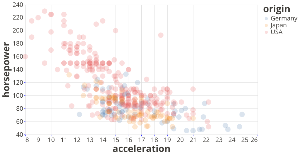 The data shown here comes from the UCI Machine Learning Repository: Auto MPG Data Set, via Gist: Scatter Plot with Menus.