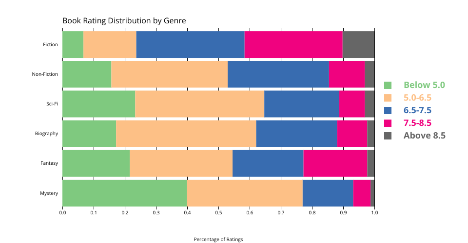 This stacked bar chart gives the percentage of each rating level within different movie genres. The aim is to show the impact of genre on movie ratings. When the mouse hovers over each bar, you can see pop-ups of accurate percentage of each rating level within each genre. Total percentage is 1, representing 100%.