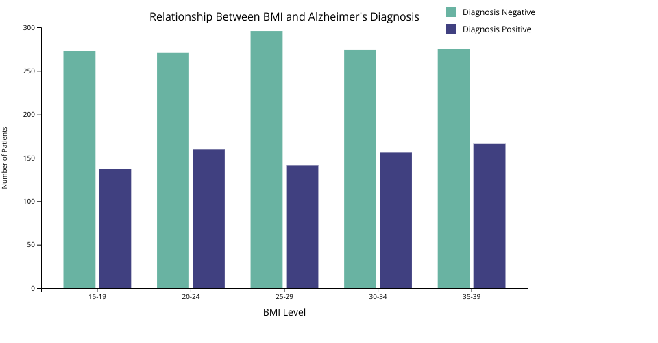 • Body Mass Index (BMI): BMI values, ranging from 15 to 40, are provided for each patient to explore the connection between physical health and Alzheimer's.