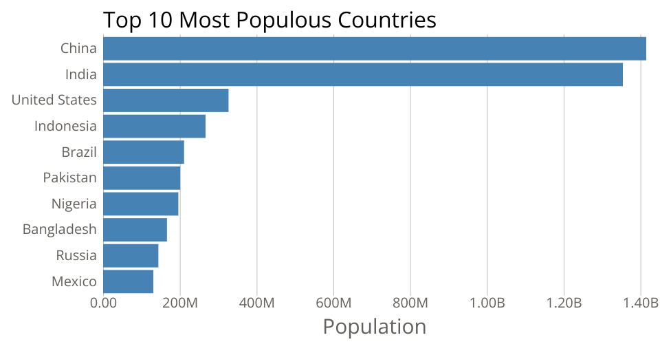 This bar chart shows population of 10 most populos countris.The data comes from the year 2018 estimate in United Nations:World Population Prospects 2017.