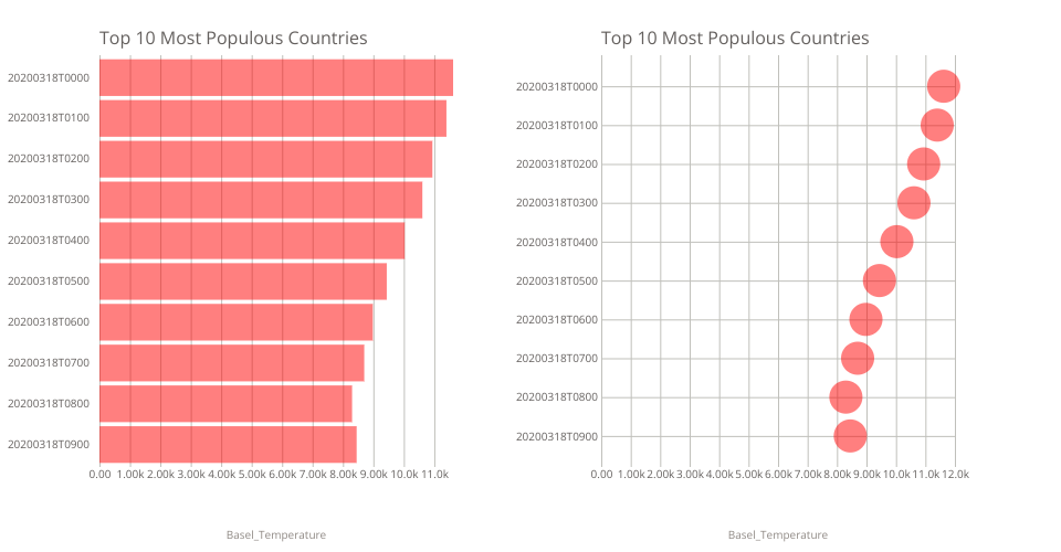 This bar chart shows population of the top 10 most populous countries. The data comes from the year 2018 estimate in United Nations: World Population Prospects 2017. It also demonstrates customization of D3 axes.