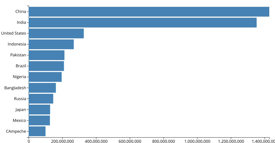 This bar chart shows population of the top 10 most populous countries. The data comes from the Year 2019 estimate in United Nations: World Population Prospects