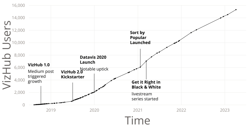 The number of total unique logged in VizHub users over time, since it was launched on August 14, 2018.