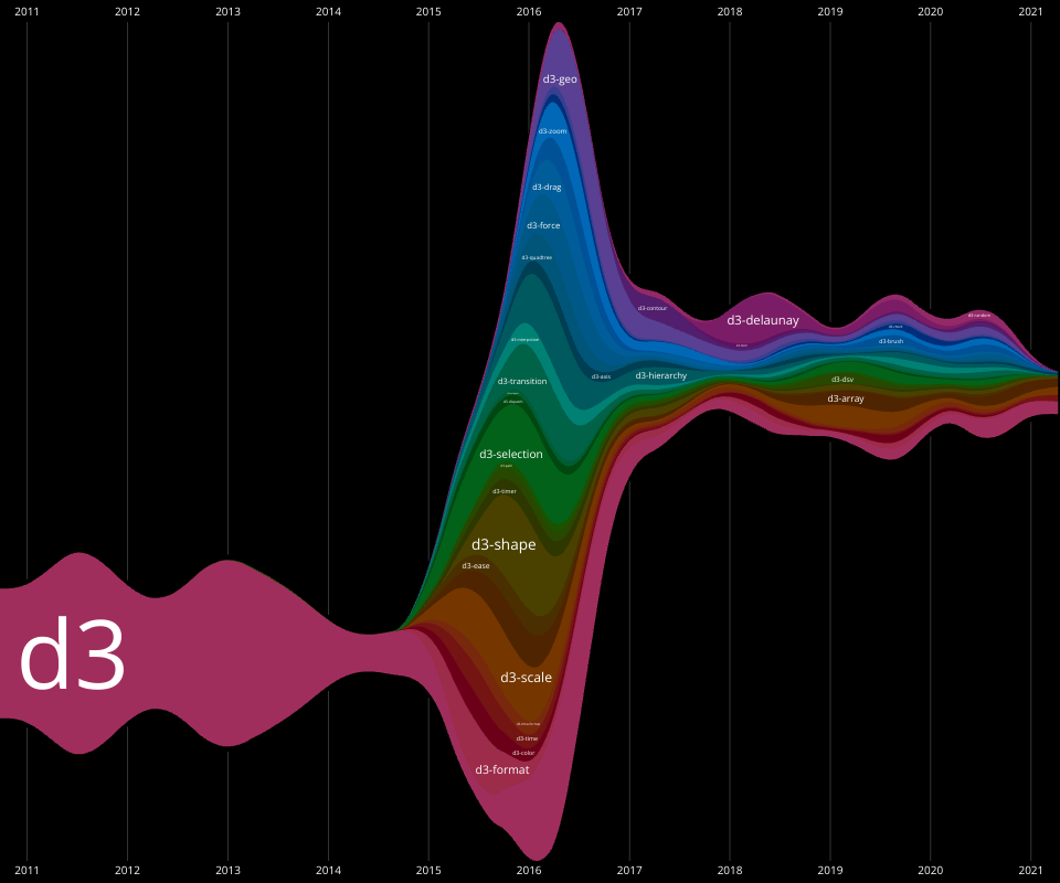 This is an experiment in visualizing D3 Git History. Each layer is a D3 repository. The thickness of each layer is the number of commits per week with smoothing applied. This visualization uses a modified Streamgraph technique where the layer order is determined by the time of the first commit. So, as you read the labels from bottom to top, that corresponds to the history of when each repository was introduced.