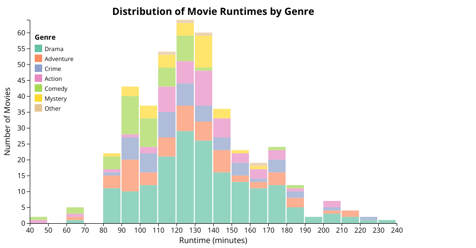 Week 10: IMDB Top 250 Movies Histogram: Distribution of Movie Runtimes by Genre