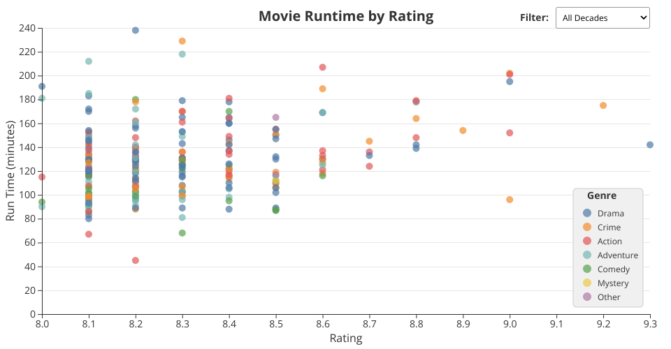 Week 10: IMDB Top 250 Movies Scatter Plot: Rating vs. Runtime