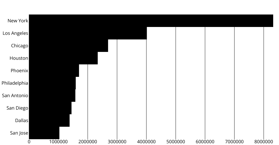 This data showing the number of top ten cities in the USA that have the largest pupulation in 2020