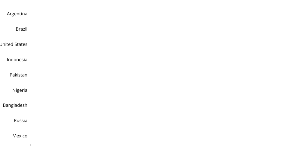 This bar chart shows population of 10 most populos countris.The data comes from the year 2018 estimate in United Nations:World Population Prospects 2017.