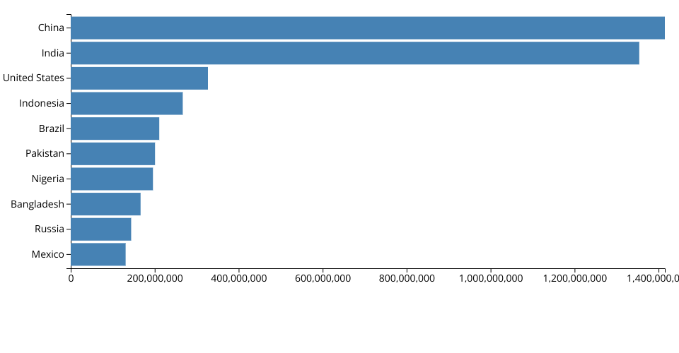 This bar charts shows population of the top 10 most populous countries. the data comes from the year 2018 estimate in World Population Prospects 2017.