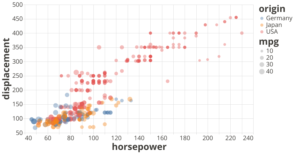 The data shown here comes from the UCI Machine Learning Repository: Auto MPG Data Set, via Gist: Scatter Plot with Menus.