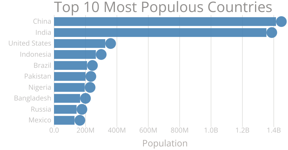 This bar chart shows population of the top 10 most populous countries. The data comes from the year 2018 estimate in United Nations: World Population Prospects 2017. It also demonstrates customization of D3 axes.