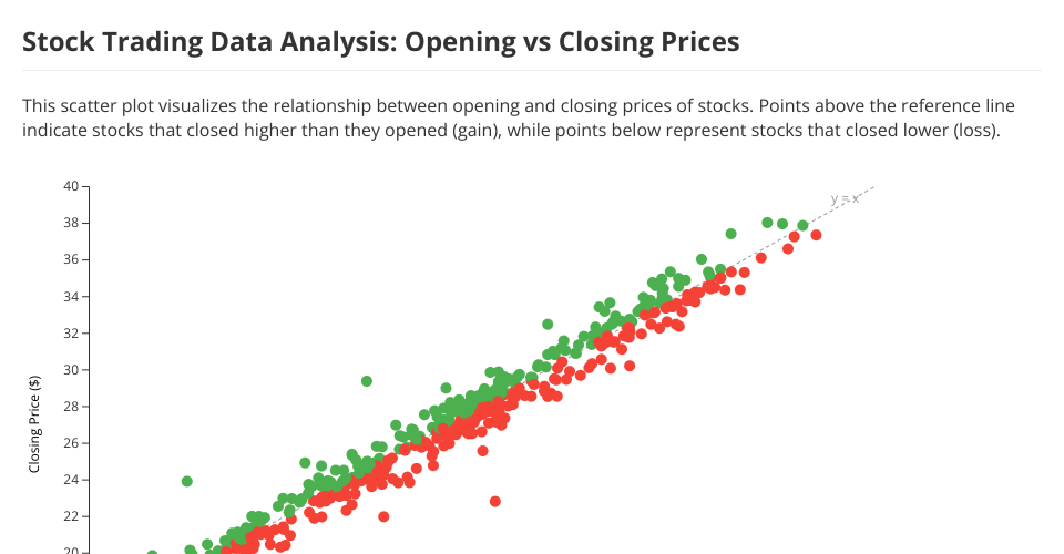 This project demonstrates a reusable D3.js scatter plot component applied to stock trading data. The visualization helps analyze the relationship between opening and closing prices of stocks.