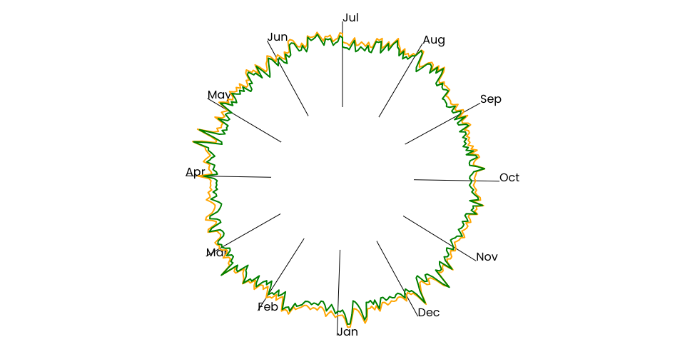 - Choosing a range for the angle scale that represents some periodic amount of time, like years, months, or weeks.