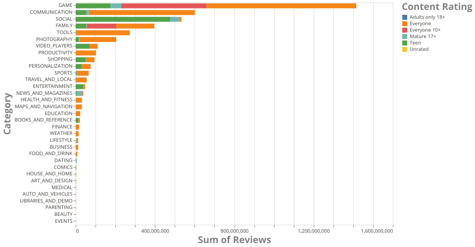 Each bar represents one App category. Each color represents the youngest age group that can rate the app.