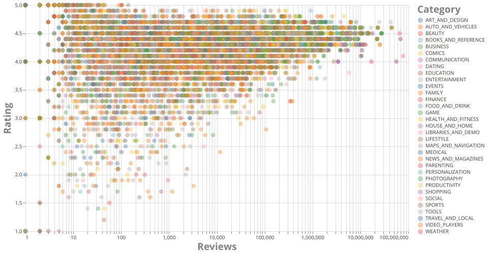 A Scatter plot for Google Play Store Apps dataset using the vega-lite-api.