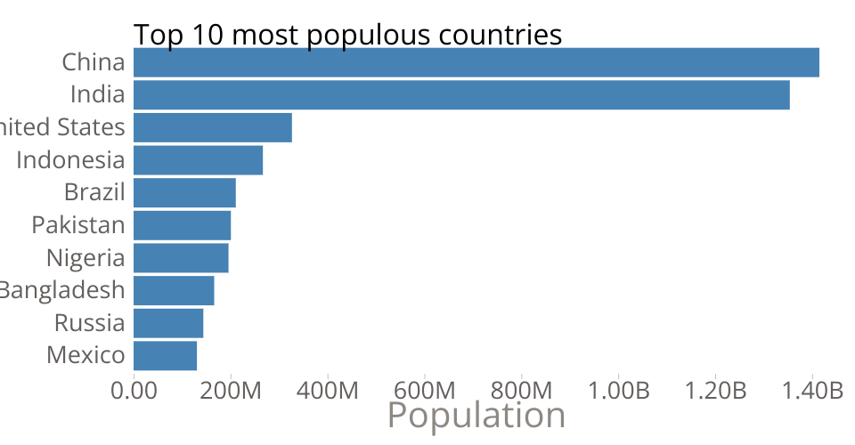 This bar chart shows population of the top 10 most populous contries. The data comes from the year 2018 estimate in United Nations: World Population Prospects 2017.