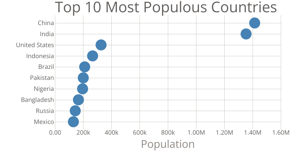 This bar chart shows population of the top 10 most populous countries. The data comes from the year 2018 estimate in United Nations: World Population Prospects 2017. It also demonstrates customization of D3 axes.