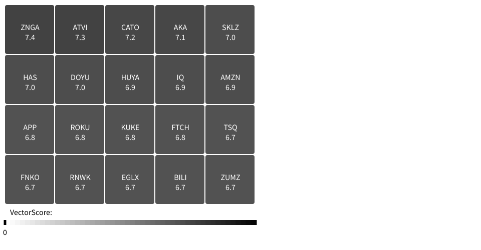 The color uses a continuous color scale on 5. The color scale rounds to the nearest .2. This makes something like 6.X to appear notably different then 7.X. The name description links to the NASDAQ query.