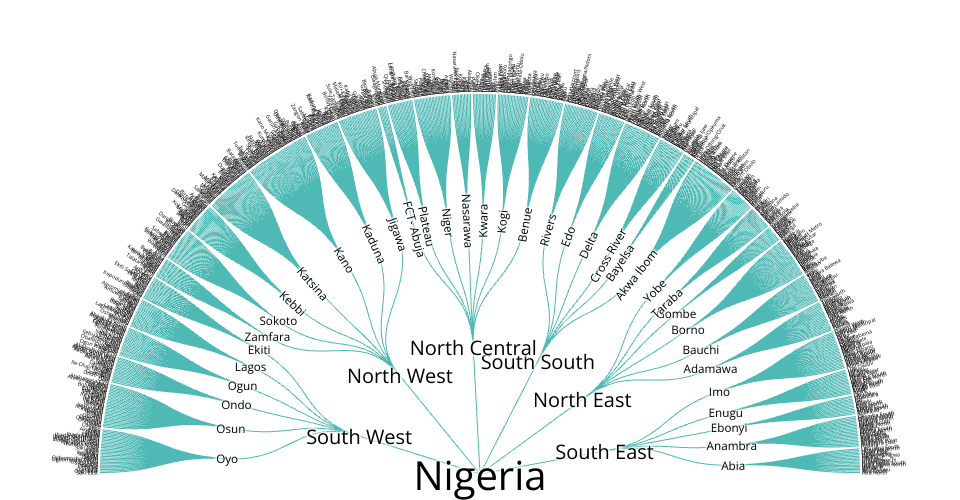 Radial Tree Visualization of Countries Hierarchy. Has Panning and Zooming interaction.