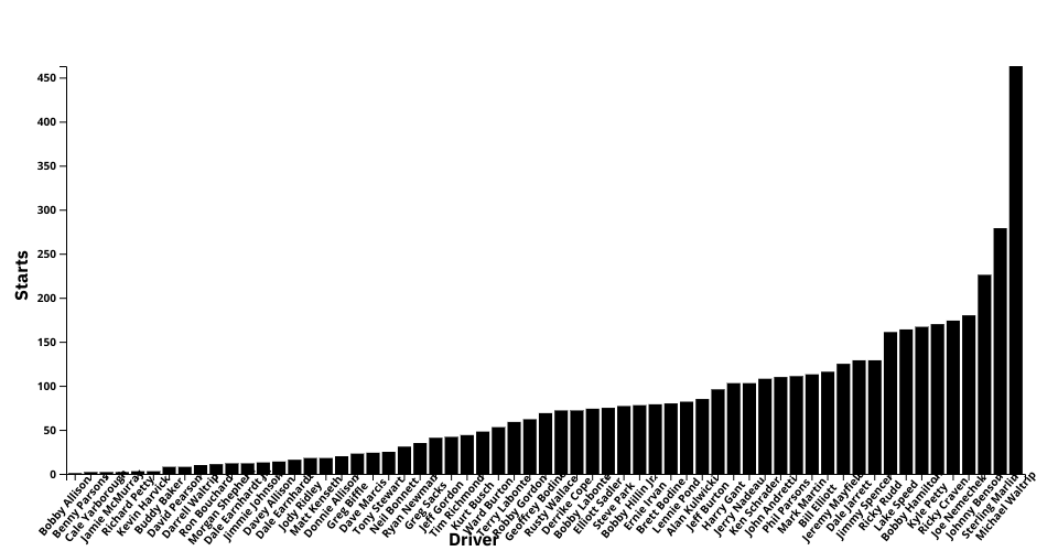 This bar chart is an expansion on a previous viz I created which shows the number of starts it took each winner in the dataset to win their first race. This comes from the NASCAR dataset, which spans from 1975 to 2003. While the data is the same, this version incorporates the idea of being able to hover over one of the bars, and get information on that driver's first win. Highlighted data includes the number of starts, the year, and the track they won on.