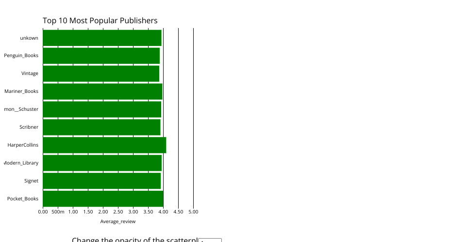 The main interaction between the 2 graphs is the highlight feature. If you hover over a datapoint or a bar it will highlight all books with the same publisher. The bottom right of the chart also a opacity drop down button that will make ot easier to see all the datapoints.