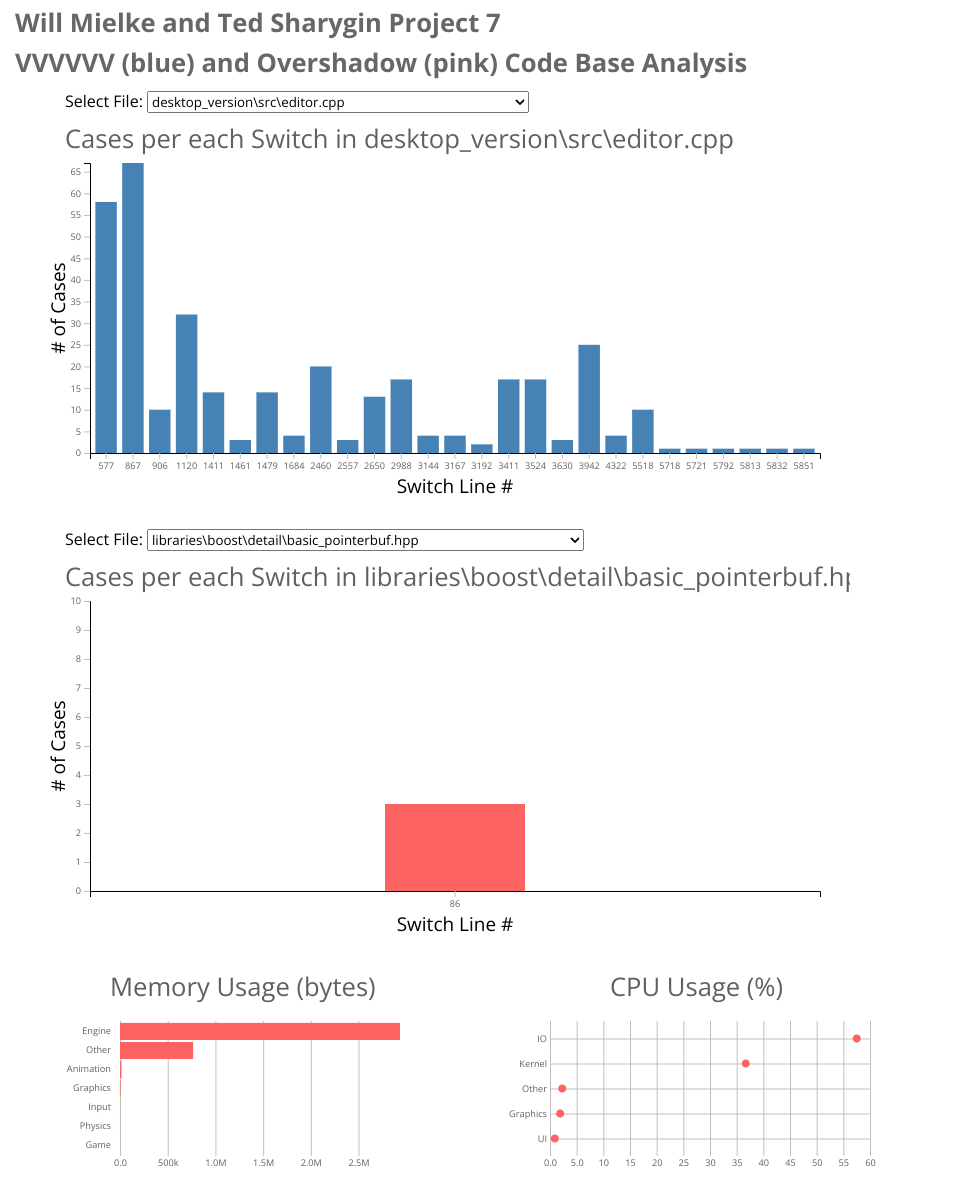 The first two graphs represent the amount of switch cases in each file for each code base. Files with 0 switch case statements were omittied. VVVVVV is the blue bar graph and the pink graph is Overshadow.