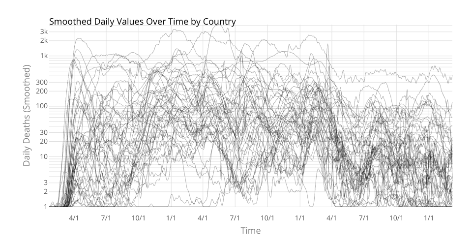 Line chart of cases by country. Data from Johns Hopkins Coronavirus Dataset.