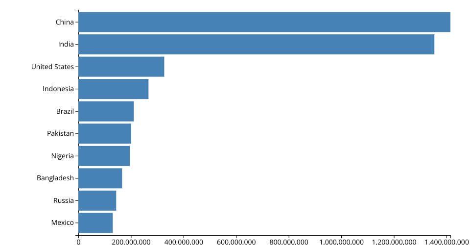 This bar chart shows population of the top 10 most populous countries. These data comes from the year 2008 estimate in UN World Population Prospects 2017.