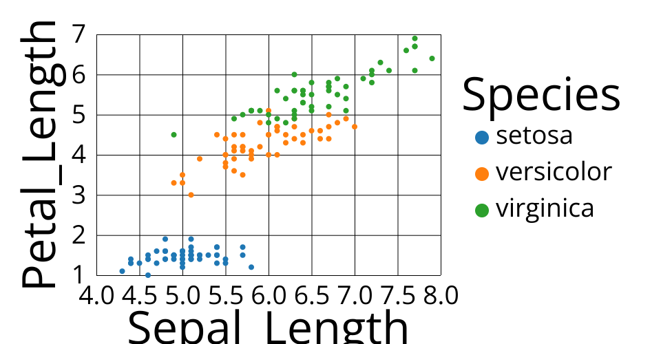 This visualization shows The Iris Dataset. It's designed to emphasize clustering by Petal Length and Sepal Length by Species.