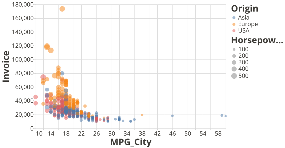 A scattered plot constructed using the vega-lite-api. This visualization shows The cars Dataset.