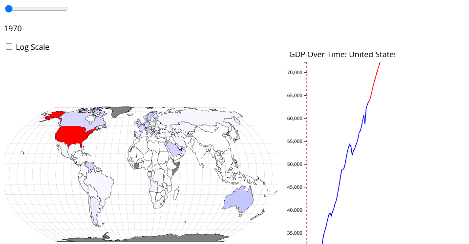 The color of each country on the map shows its GDP per capita. You can move the slider to change the year shown on the map. You can hover over a country to show its GDP over time on the plot. The red line on the plot shows the current year on the slider