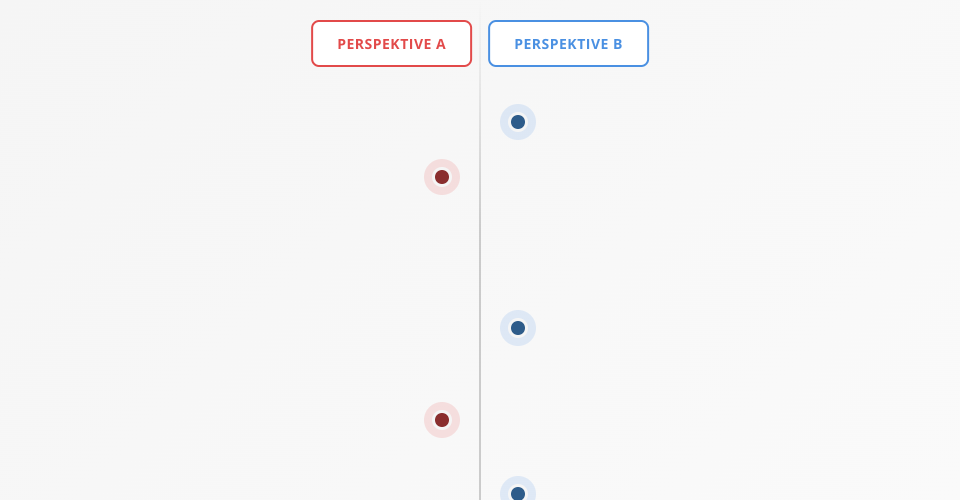 Template, um anhand einer mittig platzierten, vertikalen Timeline einzelne Events zu erzählen. Es gibt zwei Event-Stränge (links und rechts), um beispielsweise dieselbe Geschichte aus 2 Perspektiven zu erzählen. Sie lassen sich zentral über die obigen Buttons aus- und einklappen. Einzelne Events lassen sich per Klick auf die Kreise ein- und ausklappen.