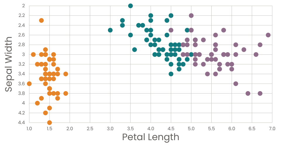 A scatter plot showing the Iris dataset and the relationship between Petal Length and Sepal Width (adaptable to any variable) using D3 and React.