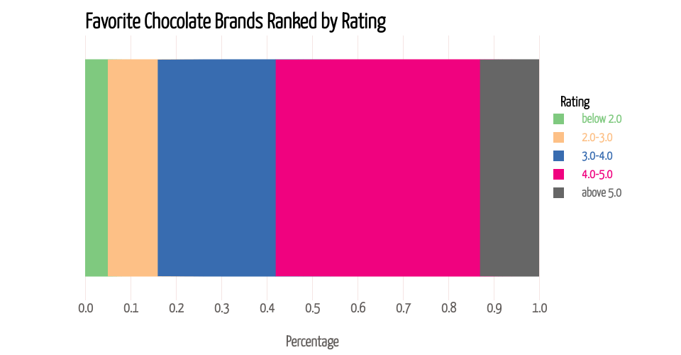 This stacked bar chart gives the percentage of each rating level within different movie genres. The aim is to show the impact of genre on movie ratings. When the mouse hovers over each bar, you can see pop-ups of accurate percentage of each rating level within each genre. Total percentage is 1, representing 100%.