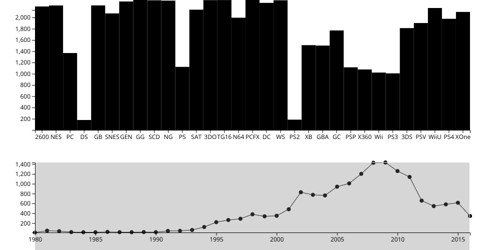 The bottom line graph shows the total number of video games released throughout each year. Brushing a year range within this line graph makes a second graph above it. This second graph is a bar chart which records the distribution of which platforms recieved releases in the selected years.