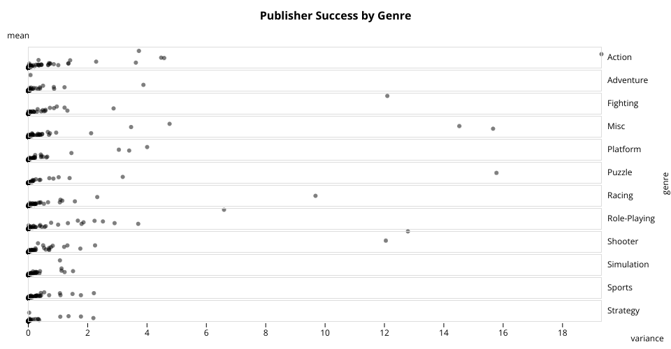 This graph contains small multiples of scatterplots of mean vs variance in the global sales of various publishers per genre.