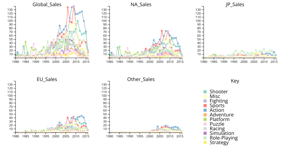 Each chart is sales for each genre of video game plotted against time. The first chart is global sales, the second is North America, third is Japan, fourth is the EU, and finally all other sales. A user may click on the graph to form a crosshair on their cursor. This functionality more easily allows points to be compared across charts.