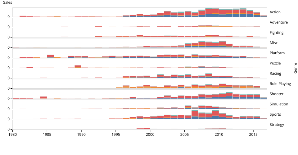 - The bars are stacked to show the contribution from each set of sales (NA, EU, JP, and Other). This was done by creating a modified dataset before passing it into the plot function.
