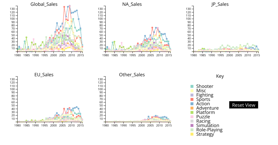 Each chart is sales for each genre of video game plotted against time. The first chart is global sales, the second is North America, third is Japan, fourth is the EU, and finally all other sales. A user may click on the graph to form a crosshair on their cursor. This functionality more easily allows points to be compared across charts.